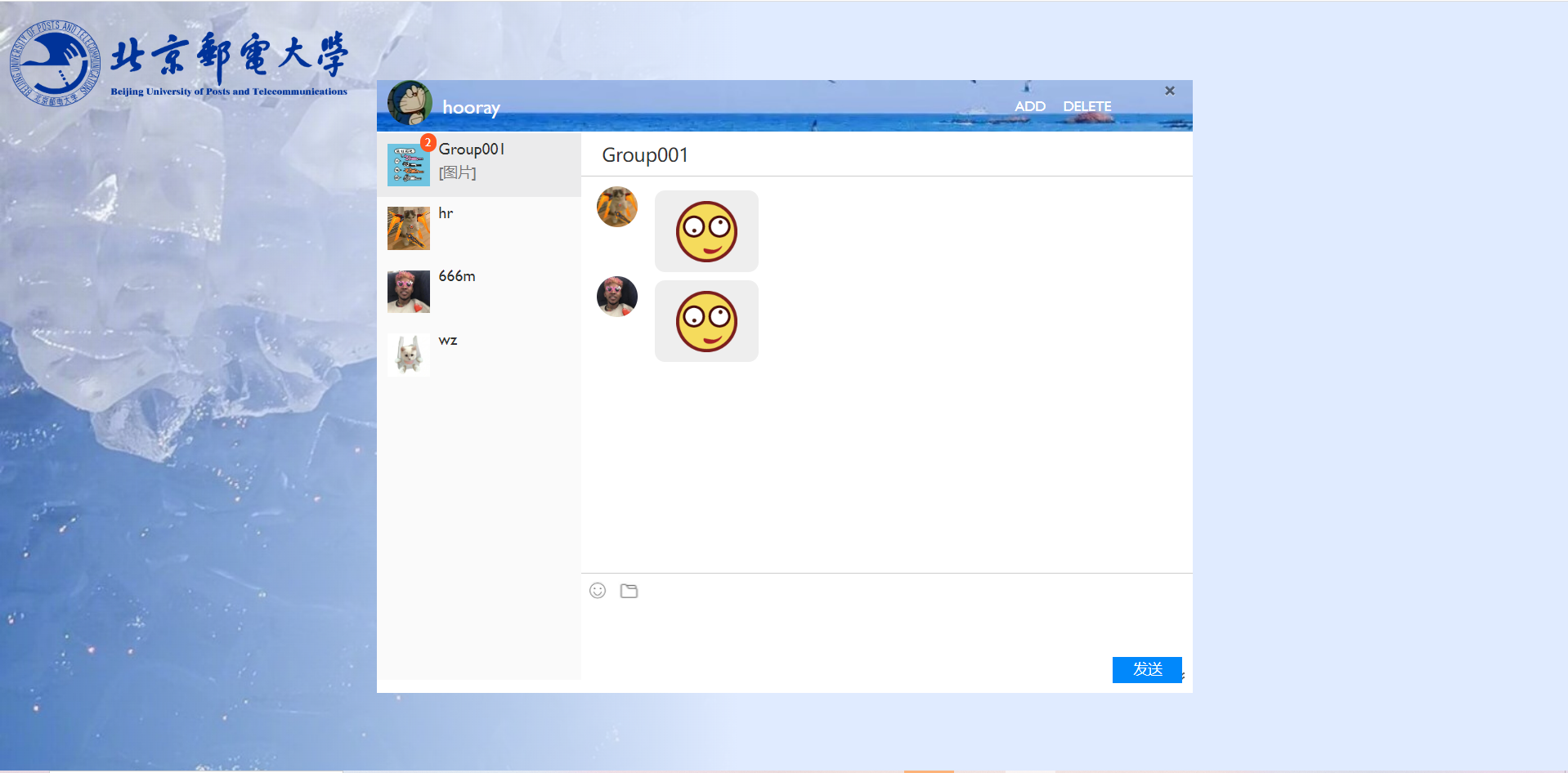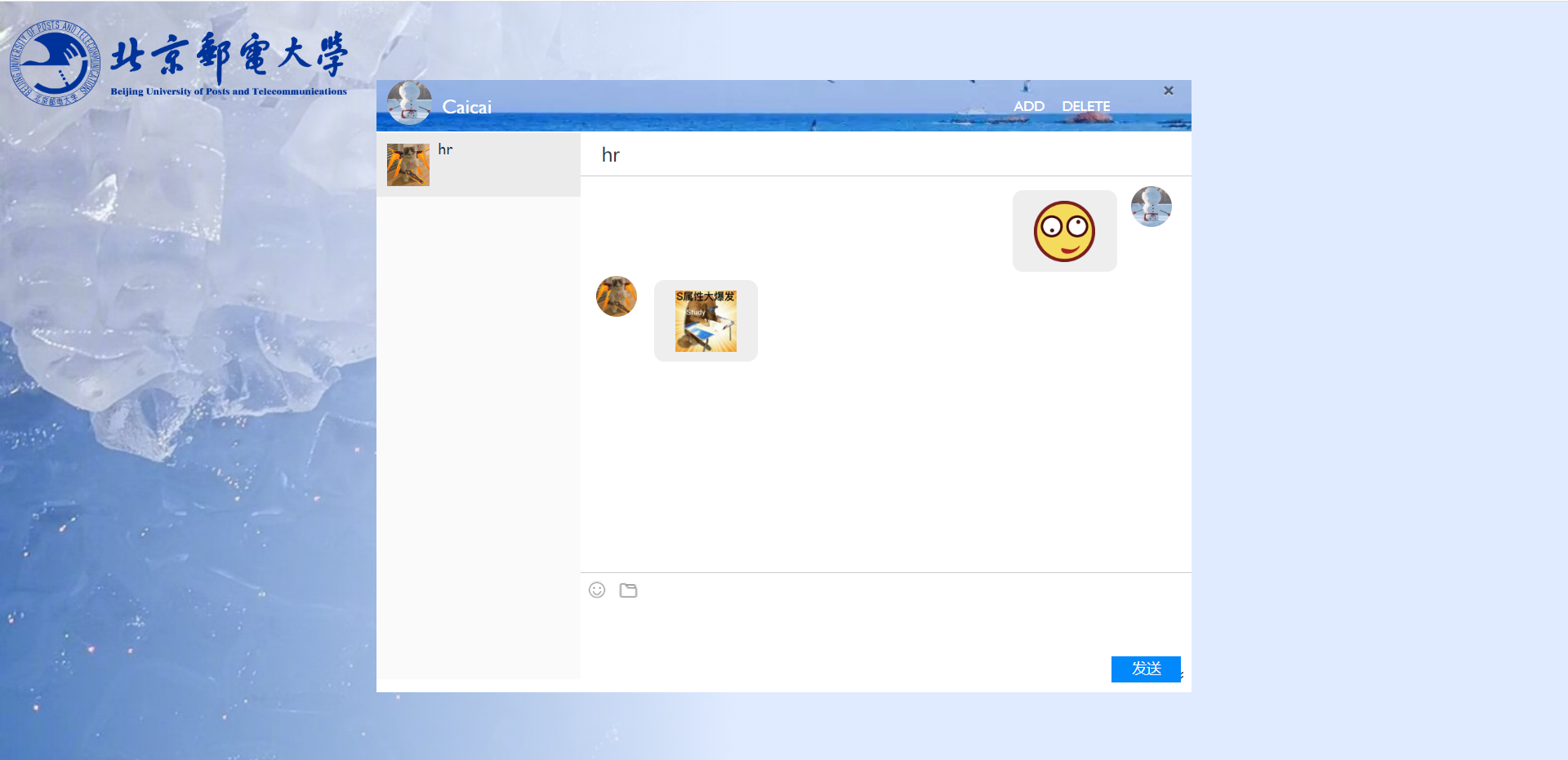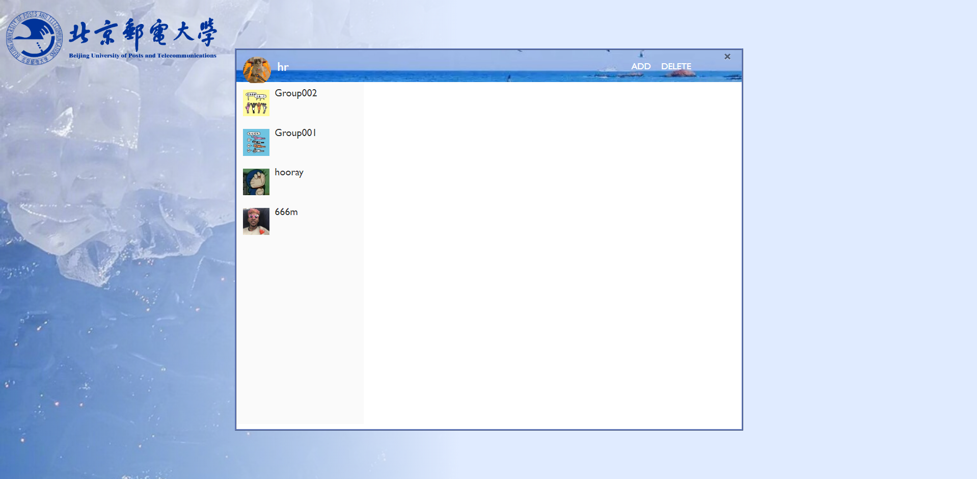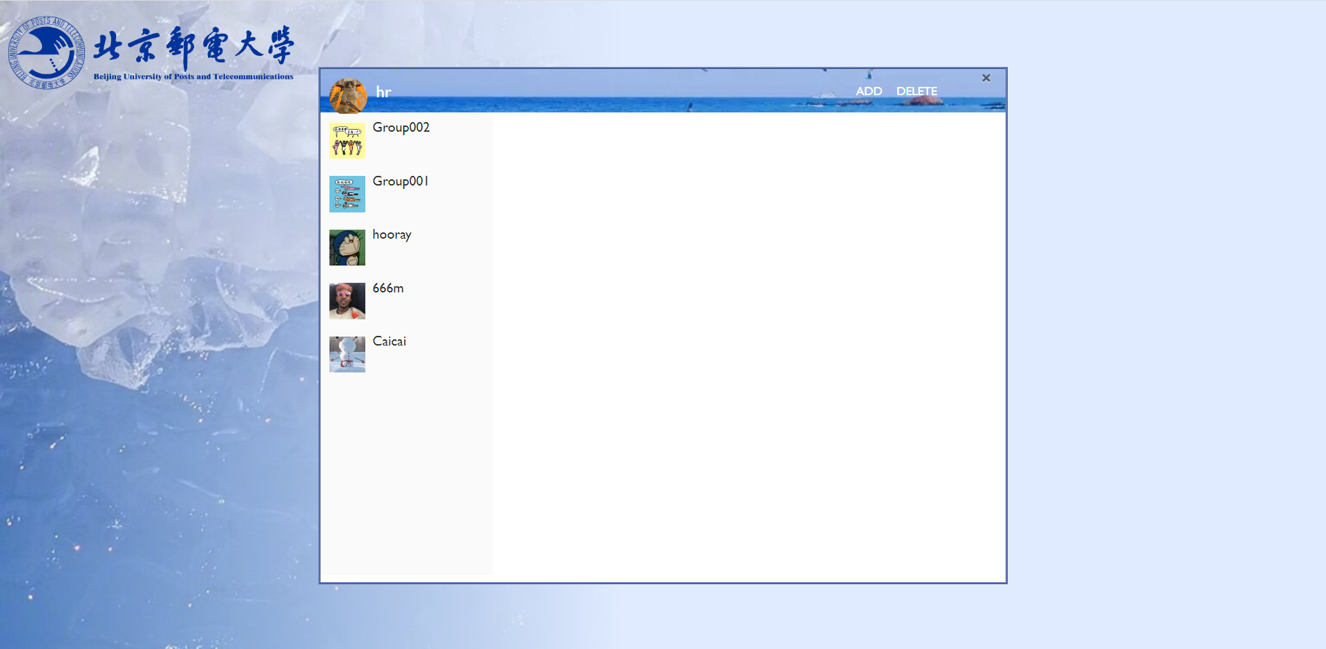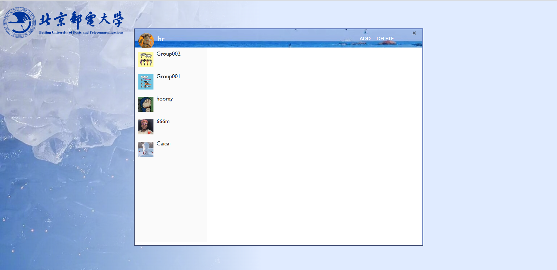 登录成功后,原始界面显示如下,ADD与DELETE在聊天框右上角,可以通过ADD进行好友添加,DELETE进行好友删除