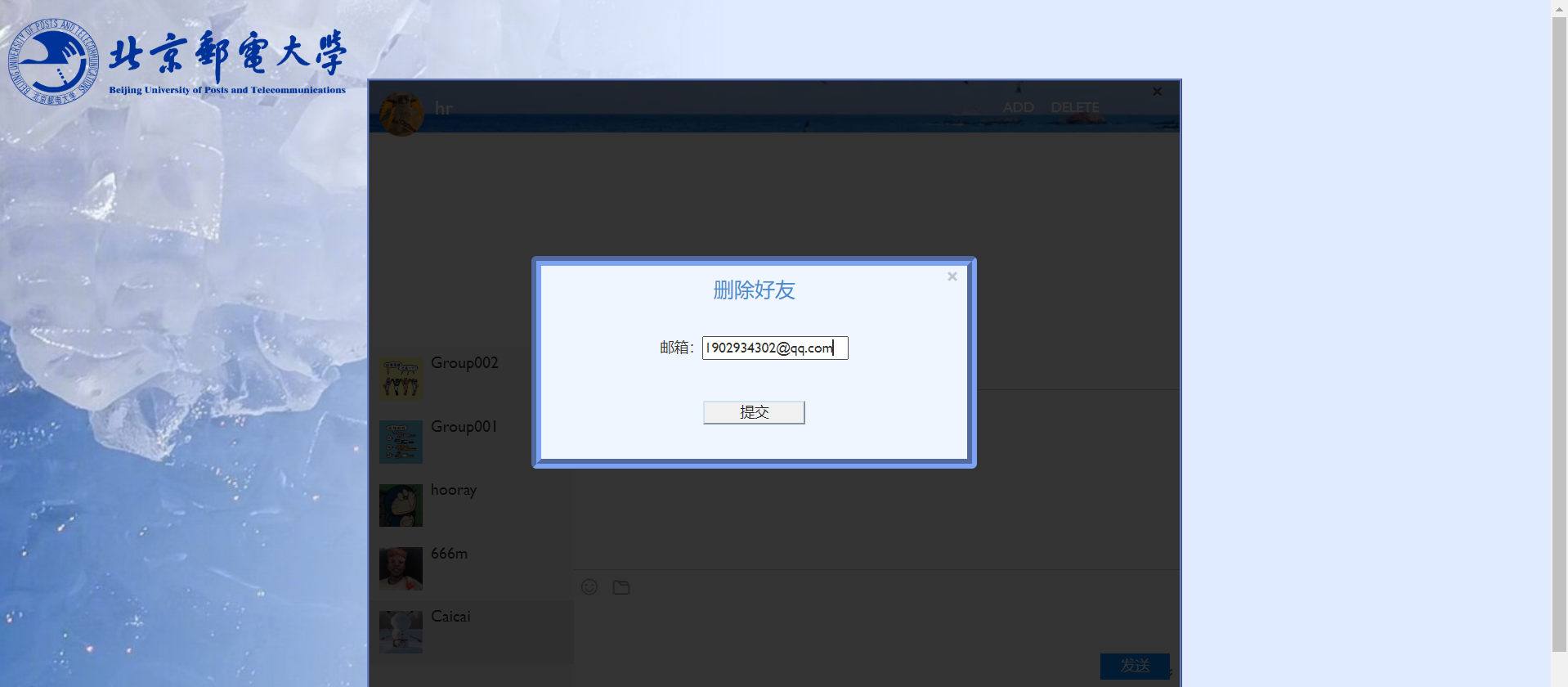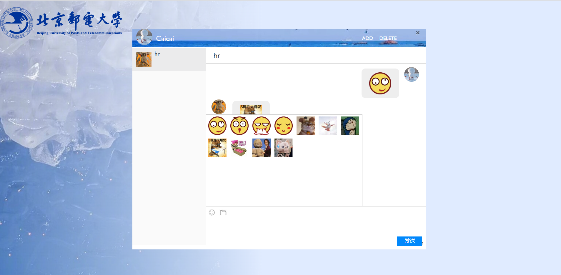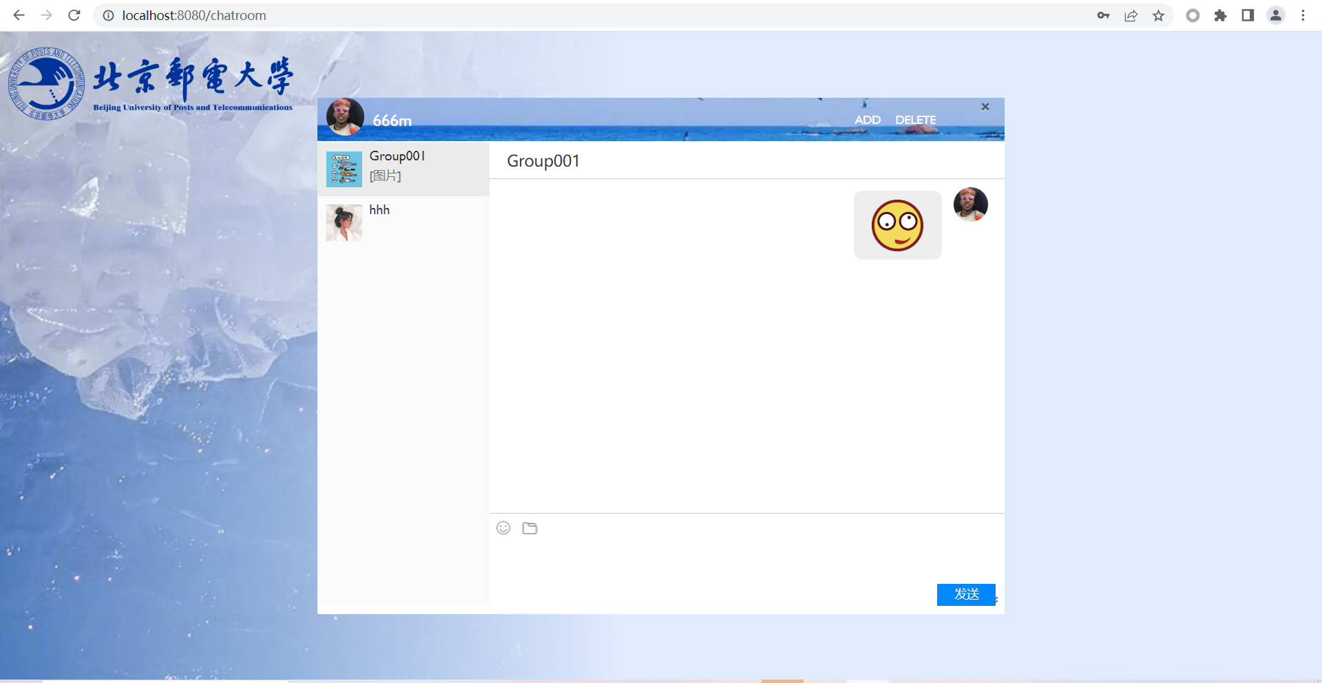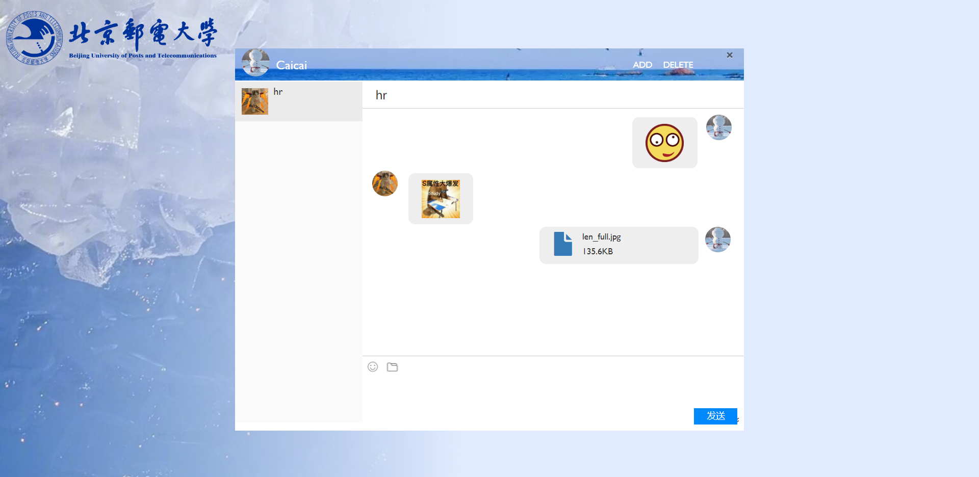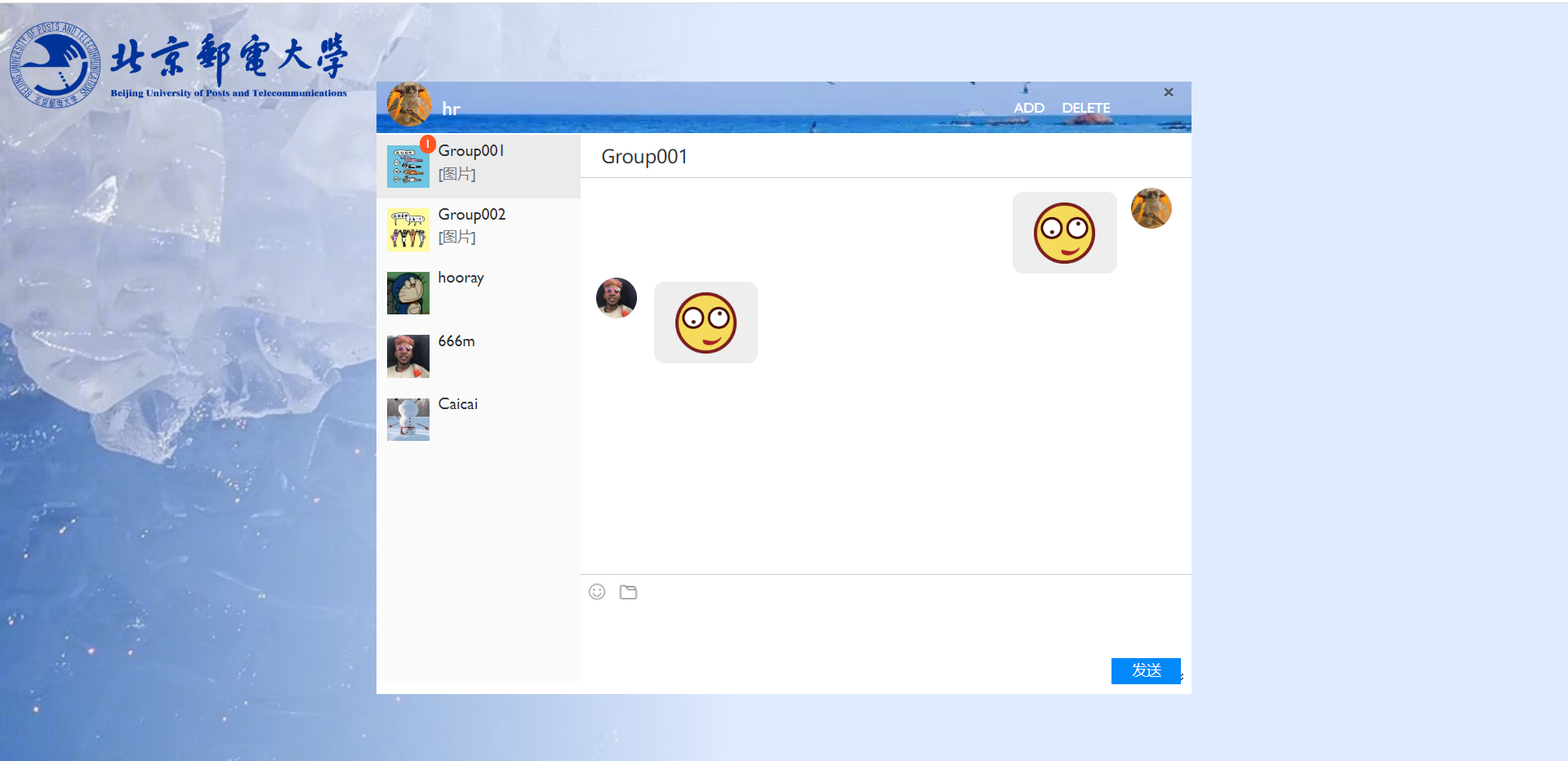 登录成功后,原始界面显示如下,ADD与DELETE在聊天框右上角,可以通过ADD进行好友添加,DELETE进行好友删除