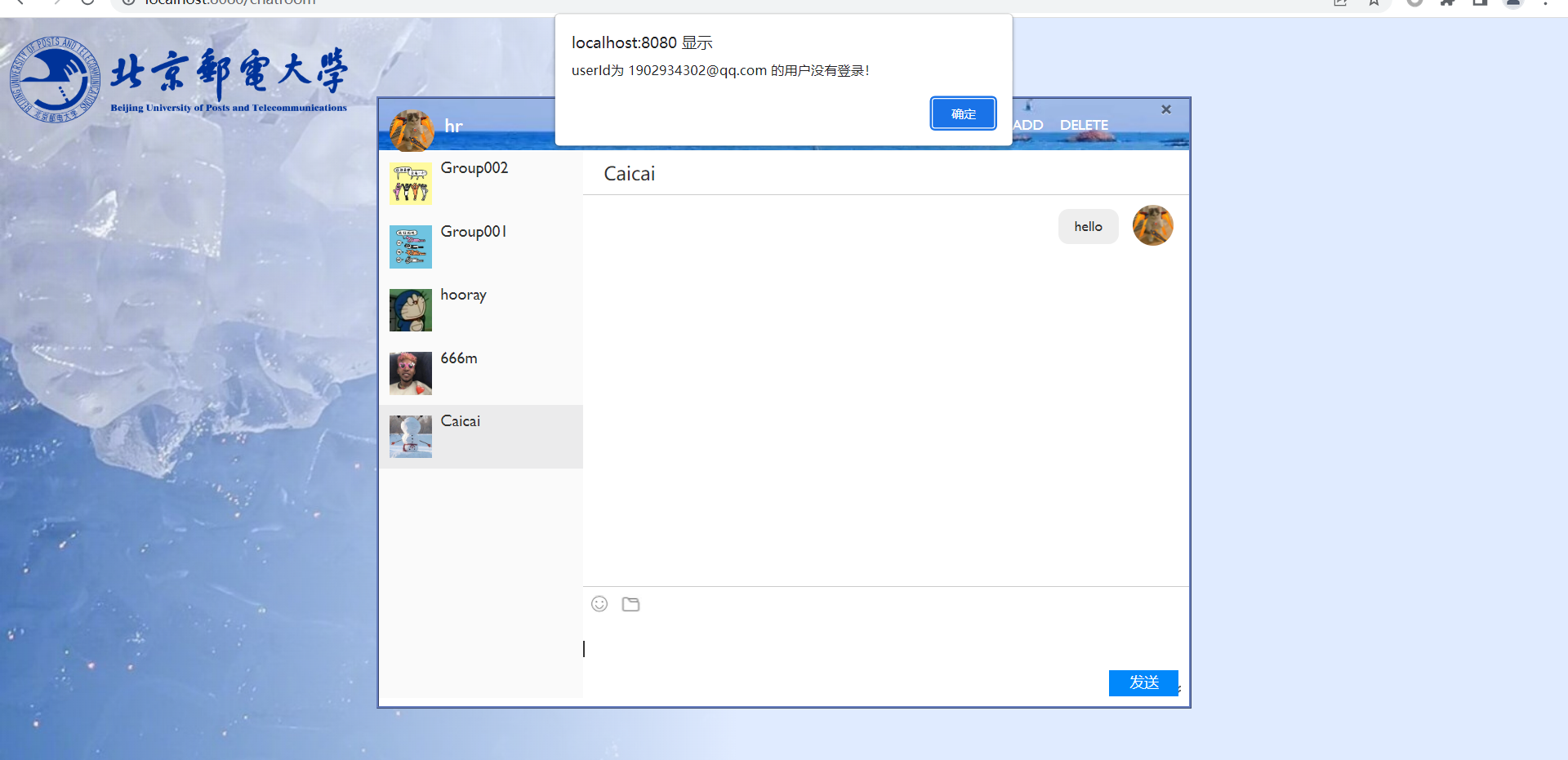 添加好友后,可以开启实时通讯系统,若好友不在线,发送消息时弹出窗口进行提示,但仍可以发送信息: